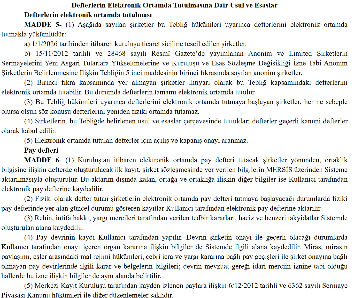 Resmi Gazete'de yayımlanan kararla 2026'dan itibaren kuruluşu ticaret siciline tescil edilen şirketler için işletmenin muhasebesiyle ilgili olmayan ticari defterlerin elektronik ortamda tutulması zorunlu kılındı. Resmi Gazete'de yayımlanan düzenlemeye göre, anonim şirketler ve yeni kurulacak şirketlere ticari defterlerini elektronik ortamda tutma zorunluluğu getirildi. İlgili tebliğe göre 1 Ocak 2026 tarihinden itibaren kuruluşu ticaret siciline tescil edilen şirketler ile anonim şirketler ve limited şirketler, sermayelerini yeni asgari tutarlara yükseltmek zorunda kalacak. Kuruluşu ve esas sözleşme değişikliği izne tabi anonim şirketler de bu yükümlülük kapsamında yer alacak. Şirketler, ihtiyari olarak bu tebliğ kapsamındaki defterlerini elektronik ortamda tutabilecek. Bu durumda defterlerin tamamı elektronik ortamda tutulacak ve şirketler, herhangi bir sebeple yeniden fiziki ortamda defter tutamayacak. Tebliğde belirtilen usul ve esaslar çerçevesinde tutulan defterler, geçerli kanuni defterler olarak kabul edilecek. Elektronik ortamda tutulan defterler için açılış ve kapanış onayı aranmayacak. Sistem üzerinde oluşturulan defterler, şirketlerin kullanımına hazır halde elektronik defter dosyası formatında Ticaret Bakanlığı'nın bilgi sisteminde muhafaza edilecek. Bakanlık, elektronik defter dosyalarının güvenli bir şekilde saklanmasını, gizliliğini, değişmezliğini, erişilebilirliğini ve bütünlüğünü sağlamakla yükümlü olacak. Kaynak: Resmi Gazete [news_id:762303]
