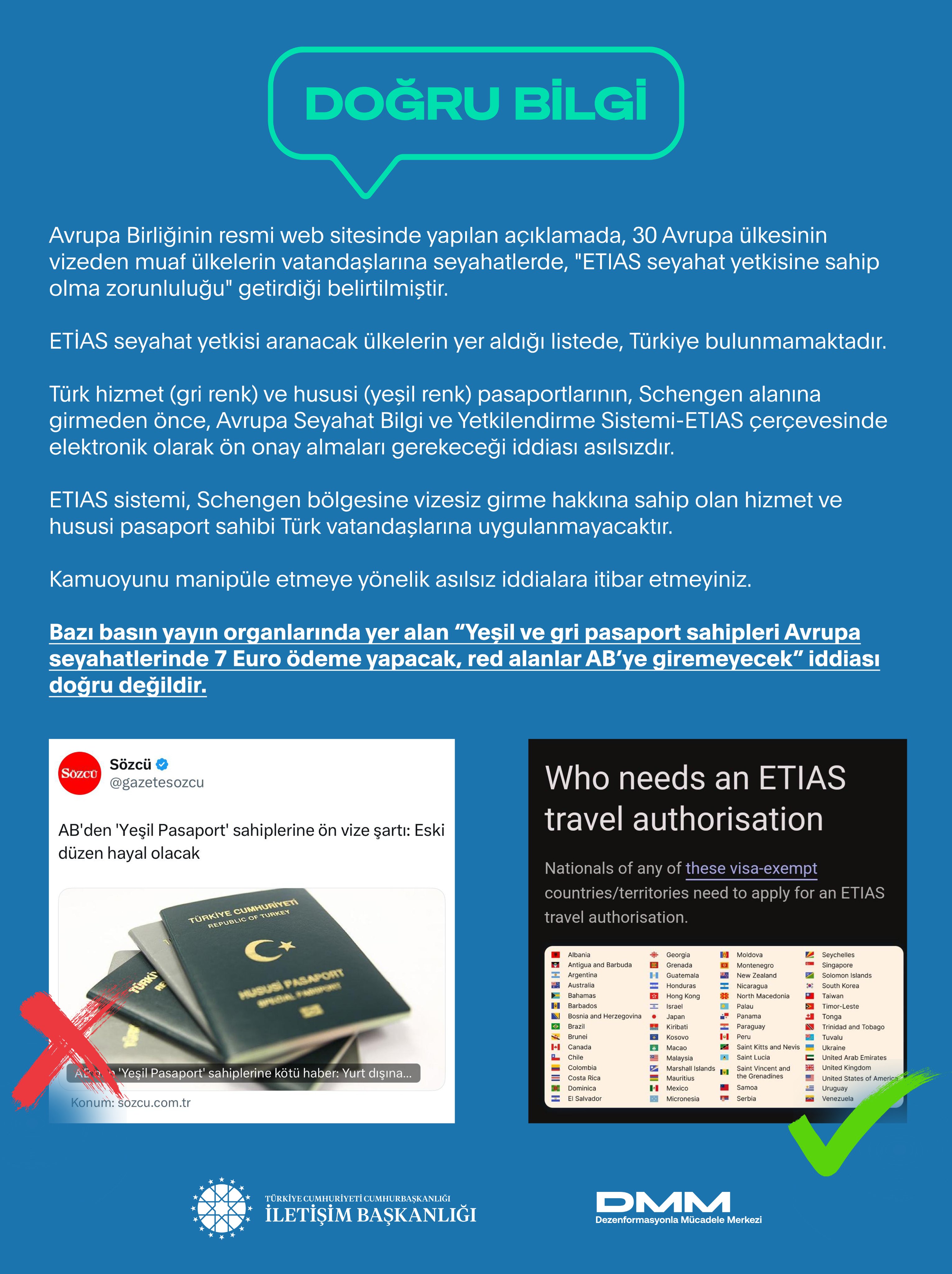 Dezenformasyonla Mücadele Merkezi (DMM), Avrupa'ya seyahat edecek gri ve yeşil pasaport sahiplerine ek prosedür uygulanacağı iddialarını yanıtladı. Bugün bazı basın organlarında yer alan Yeşil ve Gri pasaport sahiplerinin Avrupa Birliği'nin Schengen Bölgesi'ne yapacakları seyahatlere yönelik iddiaların ardından Dezenformasyonla Mücadele Merkezi’nden konuya ilişkin açıklama geldi. Buna göre DMM, “Yeşil ve gri pasaport sahipleri Avrupa seyahatlerinde 7 Euro ödeme yapacak, red alanlar AB’ye giremeyecek” iddiasının gerçeği yansıtmadığını bildirdi. Dezenformasyonla Mücadele Merkezi’nden yapılan açıklamada şunlar kaydedildi: “Avrupa Birliğinin resmi web sitesinde yapılan açıklamada, 30 Avrupa ülkesinin vizeden muaf ülkelerin vatandaşlarına seyahatlerde, "ETIAS seyahat yetkisine sahip olma zorunluluğu" getirdiği belirtilmiştir. ETİAS seyahat yetkisi aranacak ülkelerin yer aldığı listede, Türkiye bulunmamaktadır. Türk hizmet (gri renk) ve hususi (yeşil renk) pasaportlarının, Schengen alanına girmeden önce, Avrupa Seyahat Bilgi ve Yetkilendirme Sistemi-ETIAS çerçevesinde elektronik olarak ön onay almaları gerekeceği iddiası asılsızdır. ETIAS sistemi, Schengen bölgesine vizesiz girme hakkına sahip olan hizmet ve hususi pasaport sahibi Türk vatandaşlarına uygulanmayacaktır. Kamuoyunu manipüle etmeye yönelik asılsız iddialara itibar etmeyiniz." Kaynak: DMM [news_id:743894]