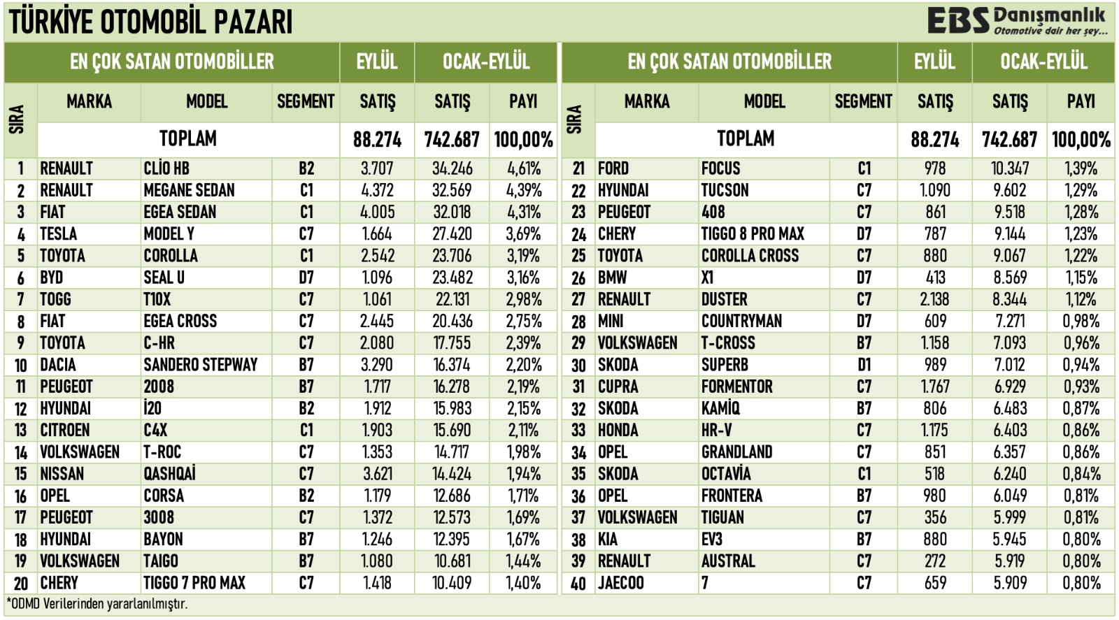 Türkiye'de ocak-eylül döneminde toplam 742 bin 687 sıfır otomobil satışı gerçekleşirken, Renault Clio bu dönemde 34 bin 246 satış adedi ile Türkiye’de en çok satılan otomobil oldu. Otomotiv Distribütörleri ve Mobilite Derneği (ODMD) verilerinden derlenen bilgilere göre otomobil satışları, ocak-eylül döneminde geçen yılın aynı dönemine göre yüzde 9,98 artarak 742 bin 687, hafif ticari araç satışları da yüzde 5,92 yükselerek 184 bin 960 olarak gerçekleşti. Türkiye otomobil ve hafif ticari araç satışları da aynı dönemde yüzde 9,15 artarak 927 bin 647 oldu. Eylülde ise otomobil ve hafif ticari araç satışları geçen senenin aynı ayına göre yüzde 25,71 artarak 110 bin 302, aynı dönemde otomobil satışları yüzde 26,77 yükselerek 88 bin 274 oldu. Hafif ticari araç pazarı eylülde yüzde 21,66 büyüyerek 22 bin 28 adet olarak kayıtlara geçti. Türkiye’de 9 ayda en çok satılan otomobil Renault Clio oldu Yılın 9 ayında Türkiye’de model bazında en çok satılan otomobiller listesinin ilk sırası değişmezken, listenin ilk 10’unda tamamen elektrikli araçlar varlığını 2 modelle sürdürdü. Aynı dönemde model bazında satışlarda Renault Clio 34 bin 246 ile Türkiye’de en çok satılan otomobil oldu. İkinci sırada 32 bin 569 ile Renault Megane bulunurken, 32 bin 18 ile Fiat Egea listede üçüncü sırada yer aldı. Bu dönemde Togg T10X en çok satılan otomobiller listesinde yedinci sırada kendisine yer buldu. ODMD verilerine göre 2025'in eylül ayı ve ocak-eylül döneminde en çok satılan ilk 10 otomobili şunlar oldu: Kaynak: EBS Danışmanlık - Emre Özpeynirci