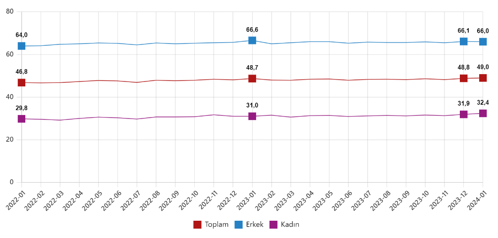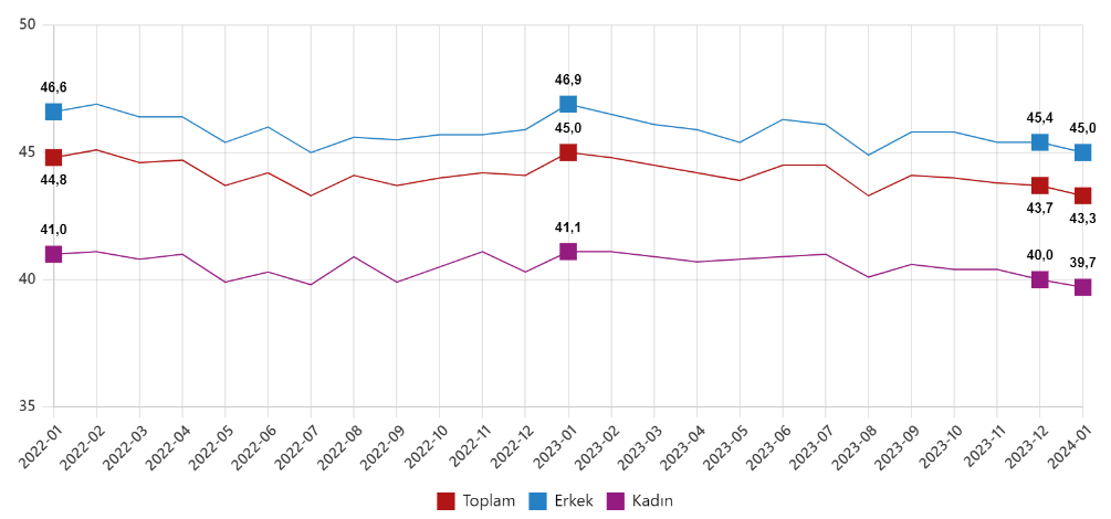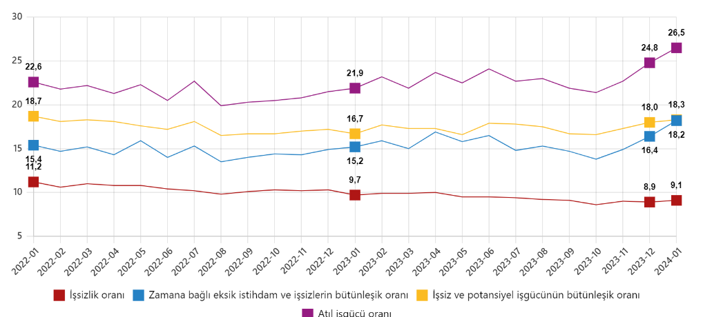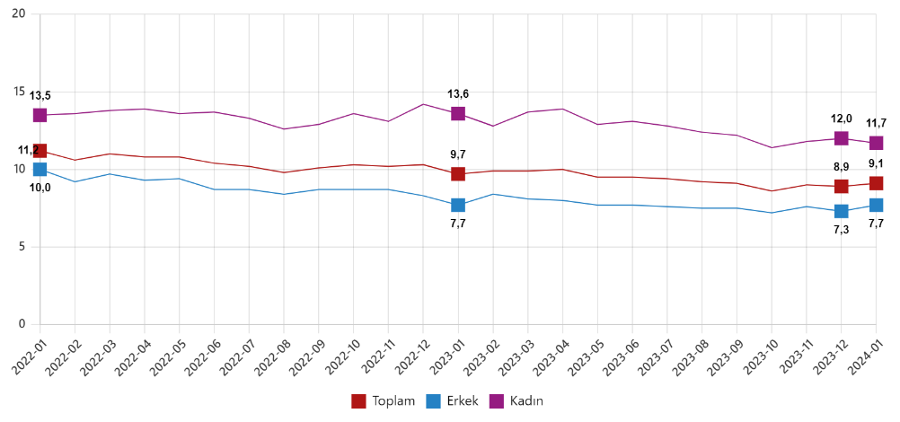 Türkiye İstatistik Kurumu (TÜİK), 2024 yılının ilk işsizlik rakamlarını açıkladı. TÜİK tarafından açıklanan verilere göre ocak ayında işsizlik oranı yüzde 9,1 seviyesinde gerçekleşti. Aralık ayında ise işsizlik yüzde 8,8 seviyesinde gerçekleşmişti. Aylık bazda yaşanan artışa rağmen işsizlik oranı 9. ayında da tek hanede kalmayı sürdürdü. Hanehalkı İşgücü Araştırması sonuçlarına göre; 15 ve daha yukarı yaştaki kişilerde işsiz sayısı 2024 yılı Ocak ayında bir önceki aya göre 85 bin kişi artarak 3 milyon 214 bin kişi oldu. İşsizlik oranı erkeklerde %7,7 iken kadınlarda %11,7 olarak tahmin edildi. [news_id:726827] Mevsim etkisinden arındırılmış işsizlik oranı, Ocak 2022 - Ocak 2024 Kaynak: TÜİK Mevsim etkisinden arındırılmış istihdam oranı %49,0 oldu İstihdam edilenlerin sayısı 2024 yılı Ocak ayında bir önceki aya göre 160 bin kişi artarak 32 milyon 222 bin kişi, istihdam oranı ise 0,2 puan artarak %49,0 oldu. Bu oran erkeklerde %66,0 iken kadınlarda %32,4 olarak gerçekleşti. Mevsim etkisinden arındırılmış istihdam oranı, Ocak 2022 - Ocak 2024 Kaynak: TÜİK Mevsim etkisinden arındırılmış işgücüne katılma oranı %53,9 olarak gerçekleşti İşgücü 2024 yılı Ocak ayında bir önceki aya göre 245 bin kişi artarak 35 milyon 436 bin kişi, işgücüne katılma oranı ise 0,3 puan artarak %53,9 olarak gerçekleşti. İşgücüne katılma oranı erkeklerde %71,5 iken kadınlarda %36,6 oldu. Genç nüfusta mevsim etkisinden arındırılmış işsizlik oranı %16,6 oldu 15-24 yaş grubunu kapsayan genç nüfusta işsizlik oranı bir önceki aya göre 1,1 puan artarak %16,6 oldu. Bu yaş grubunda işsizlik oranı; erkeklerde %14,1, kadınlarda ise %21,1 olarak tahmin edildi. Mevsim ve takvim etkilerinden arındırılmış haftalık ortalama fiili çalışma süresi 43,3 saat oldu İstihdam edilenlerden referans döneminde işbaşında olanların, mevsim ve takvim etkilerinden arındırılmış haftalık ortalama fiili çalışma süresi 2024 yılı Ocak ayında bir önceki aya göre 0,4 saat azalarak 43,3 saat olarak gerçekleşti. Mevsim ve takvim etkilerinden arındırılmış haftalık ortalama fiili çalışma süresi, Ocak 2022 - Ocak 2024 Kaynak: TÜİK Mevsim etkisinden arındırılmış atıl işgücü oranı %26,5 oldu Zamana bağlı eksik istihdam, potansiyel işgücü ve işsizlerden oluşan atıl işgücü oranı 2024 yılı Ocak ayında bir önceki aya göre 1,7 puan artarak %26,5 oldu. Zamana bağlı eksik istihdam ve işsizlerin bütünleşik oranı %18,2 iken işsiz ve potansiyel işgücünün bütünleşik oranı %18,3 olarak tahmin edildi. Mevsim etkisinden arındırılmış işgücüne ilişkin tamamlayıcı göstergeler, Ocak 2022 - Ocak 2024 Kaynak: TÜİK Bu konu ile ilgili bir sonraki haber bülteninin yayımlanma tarihi 25 Mart 2024'tür.