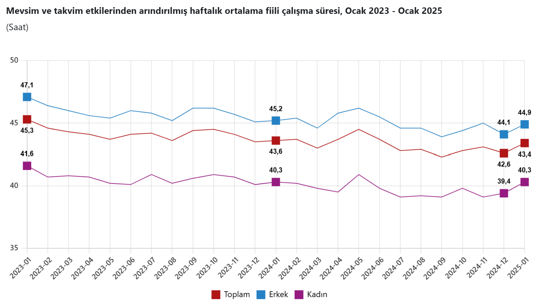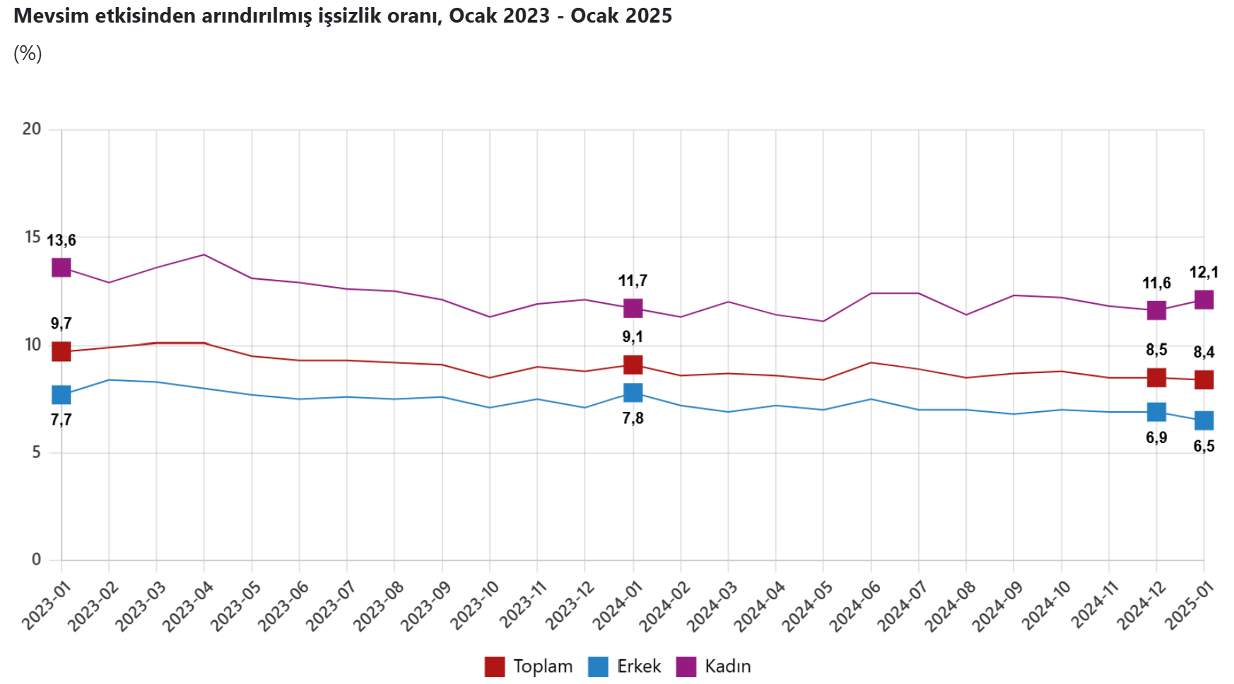 Türkiye İstatistik Kurumu (TÜİK), 2025 yılının ilk işsizlik rakamlarını açıkladı. TÜK'in Hanehalkı İşgücü Araştırması sonuçlarına göre 15 ve daha yukarı yaştaki kişilerde işsiz sayısı 2025 yılı Ocak ayında bir önceki aya göre 25 bin kişi azalarak 3 milyon 2 bin kişi oldu. İşsizlik oranı ise 0,1 puan azalarak %8,4 seviyesinde gerçekleşti. Böylelikle Türkiye'de işsizlik oranı 12 yılın en düşük seviyesine geriledi. Son olarak 2012 yılının Eylül ayında işsizlik oranı yüzde 8,3'e inmişti. Bu dönemde işsizlik oranı erkeklerde %6,5 iken kadınlarda ise %12,1 olarak tahmin edildi. Kaynak: TÜİK Mevsim etkisinden arındırılmış istihdam oranı %49,2 İstihdam edilenlerin sayısı 2025 yılı Ocak ayında bir önceki aya göre 195 bin kişi azalarak 32 milyon 531 bin kişi, istihdam oranı ise 0,3 puan azalarak %49,2 oldu. Bu oran erkeklerde %66,4 iken kadınlarda %32,3 olarak gerçekleşti. İşgücü 2025 yılı Ocak ayında bir önceki aya göre 219 bin kişi azalarak 35 milyon 534 bin kişi, işgücüne katılma oranı ise 0,4 puan azalarak %53,7 olarak gerçekleşti. İşgücüne katılma oranı erkeklerde %71,0 iken kadınlarda %36,7 oldu. Genç nüfusta işsizlik %14,9 15-24 yaş grubunu kapsayan genç nüfusta işsizlik oranı bir önceki aya göre 0,8 puan azalarak %14,9 oldu. Bu yaş grubunda işsizlik oranı; erkeklerde %10,6, kadınlarda ise %22,7 olarak tahmin edildi. Haftalık ortalama fiili çalışma süresi 43,4 saat İstihdam edilenlerden referans döneminde işbaşında olanların, mevsim ve takvim etkilerinden arındırılmış haftalık ortalama fiili çalışma süresi 2025 yılı Ocak ayında bir önceki aya göre 0,8 saat artarak 43,4 saat olarak gerçekleşti. Kaynak: TÜİK Atıl işgücü oranı %28,1 Zamana bağlı eksik istihdam, potansiyel işgücü ve işsizlerden oluşan atıl işgücü oranı 2025 yılı Ocak ayında bir önceki aya göre 0,1 puan artarak %28,1 oldu. Zamana bağlı eksik istihdam ve işsizlerin bütünleşik oranı %18,8 iken işsiz ve potansiyel işgücünün bütünleşik oranı %18,9 olarak tahmin edildi.