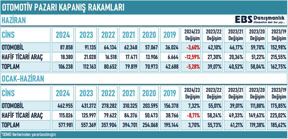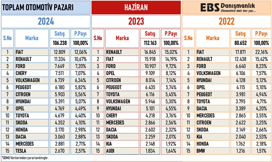 Otomotiv pazarında haziran ayında yıllık olarak gerileme yaşansa da aylık bazda satışlar kampanyaların da etkisiyle 100 bin barajının üzerinde kaldı. Peki, yılın ilk altı ayında pazarda en çok hangi araç markaları satıldı? İşte detaylar.. Otomotiv Distribütörleri ve Mobilite Derneği (ODMD) verilerine göre, haziran ayı otomobil ve hafif ticari araç pazarı 2023 yılı Haziran ayına göre yüzde 5,3 azalarak 106 bin 238 adet oldu. Haziran ayında otomobil satışları yüzde 3,6 azalarak 87 bin 858 adet olurken, hafif ticari araç satışları yüzde 12,6 azalarak 18 bin 380 adet olarak gerçekleşti. Kaynak: ODMD Haziranda en çok satan markalar Otomotiv gazetecisi Emre Özpeynirci'nin aktardığına göre haziranda toplam satışlarda Fiat liderliği geri aldı. Mayısta dördüncü sıraya kadar inen Fiat, kampanyaların dozunu artırdığı haziranda 12.809 adet satışla ilk sırada yer alırken, mayısta ilk sırada yer alan Renault ikinciliğe geriledi. Ford'un üçüncü sırada yer aldığı listenin sürprizi ise dördüncü sıraya çıkan Chery oldu. Kaynak: EBS Danışmanlık 6 ayda satışlar 580 bine yaklaştı Türkiye otomobil ve hafif ticari araç toplam pazarı, 2024 yılı Ocak-Haziran döneminde bir önceki yılın aynı dönemine göre yüzde 3,7 oranında artarak 577 bin 981 adede ulaştı. Aynı dönem itibarıyla otomobil satışları, 2024 yılı Ocak-Haziran döneminde geçen yıla göre yüzde 7,3 oranında artarak 462 bin 955 adet, hafif ticari araç pazarı ise yüzde 8,7 azalarak 115 bin 26 adet oldu. Kaynak: EBS Danışmanlık - X Yılın ilk yarısında en çok satan markalar Öte yandan 2024 yılının ilk altı aylık verilerine göre toplam satışlarda Fiat liderliğini devam ettirdi. Listede Renault ikinci sırada yer alırken, Ford üçüncü, Volkswagen dördüncü, Chery ise beşinci sırada yer aldı. Kaynak: EBS Danışmanlık Benzinli araçlar liderliği bırakmadı Satışların detayına bakıldığında ise otomobil pazarından motor tipine göre; • Benzinli otomobil satışları 305.550 adetle %66 pay, • Hibrit otomobil satışları 64.921 adetle %14 pay, • Dizel otomobil satışları 50,064 adetle %10,8 pay, • Elektrikli otomobil satışları 39.405 adetle %8,5 pa, • Otogazlı otomobil satışları 3.015 adetle %0,7 pay aldı. Otomatik araçlar popülerliğini korudu Otomatik şanzımanlı otomobiller; 418.701 adetle %90,4 pay alırken, manuel şanzımanlı otomobiller 44.254 adetle %9,6 pay aldı. Kaynak: ODMD [news_id:738122]