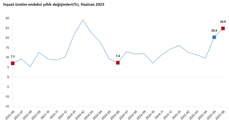 TÜİK verilerine göre inşaat üretimi yıllık bazda yüzde 24,9 artış ile son 16 ayın en güçlü yükselişini kaydetti. Türkiye İstatistik Kurumu (TÜİK), haziran ayına ilişkin inşaat üretim endeksi verilerini açıkladı. TÜİK verilerine göre endeks haziranda yıllık bazda yüzde 24,9 artış kaydetti. İnşaatın alt sektörleri incelendiğinde endeksin, haziranda geçen yılın aynı ayına kıyasla bina inşaatı sektöründe yüzde 26,9, bina dışı yapıların inşaatında yüzde 16,7 ve özel inşaat faaliyetlerinde yüzde 23,6 yükseldiği görüldü. Kaynak: TÜİK İnşaat üretim endeksi haziranda aylık bazda ise yüzde 3,2 artış kaydetti. Endeks, haziranda bina inşaatı sektöründe ve bina dışı yapıların inşaatında bir önceki aya göre yüzde 3,1, özel inşaat faaliyetlerinde yüzde 3,7 artış gösterdi. Kaynak: TÜİK