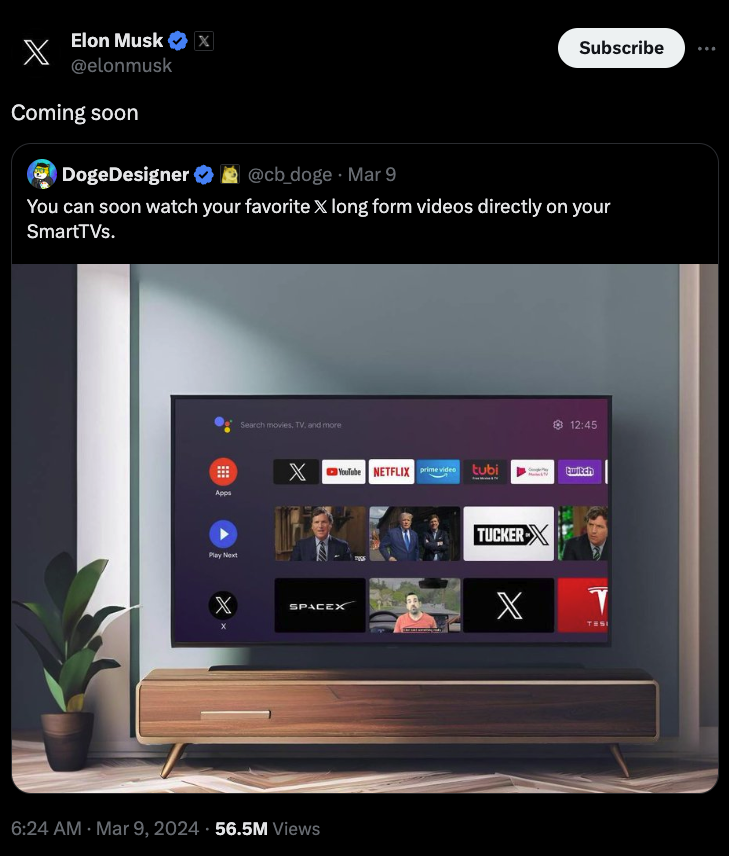 Elon Reeve Musk, Twitter'da yani X'te değişimlerine devam ediyor ... SpaceX uzay şirketinin kurucusu, CEO'su, Tesla otomotiv şirketinin CEO'su, The Boring Company şirketinin kurucusu, Neuralink, Starlink ile OpenAI'nin kurucu ortağı ünlü milyarder Elon Musk televizyonlar için uzun videolar içeren bir X uygulamasının geleceğini söyledi. Twitter'ı satın aldığından bu yana adından başlayarak birçok önemli değişiklik ve yenilik kazandıran Elon Musk, zaten X'in video ağırlıklı bir site olacağının işaretlerini vermiş hatta bunu bizzat dile de getirmişti. Her ne kadar ölçme&değerlendirme kuruluşları X'in 2023'te yaklaşık 30% zarar ettiğini bildirse de, ünlü milyarder değişikliklerine ve marjinal fikirlerine hız kesmeden devam ediyor. Son olarak DogeDesigner hesabından paylaşılan tweet'te Samsung TV ve Amazon Fire TV ile başlayacak süreçle X platformunun televizyonlar için uzun videolar içeren bir uygulama piyasaya süreceğini belirtti.