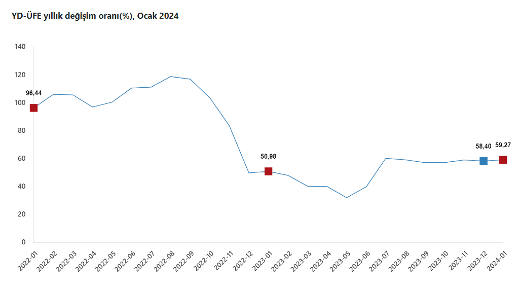 TÜİK verilerine göre Yurt Dışı Üretici Fiyat Endeksi (YD-ÜFE) yıllık yüzde 59,27, aylık ise yüzde 4,57 artış kaydetti. Türkiye İstatistik Kurumu (TÜİK) 2024 Ocak ayına ilişkin Yurt Dışı Üretici Fiyat Endeksini (YD-ÜFE) açıkladı. YD-ÜFE 2024 yılı ocak ayında bir önceki aya göre yüzde 4,57 artış, bir önceki yılın aralık ayına göre yüzde 4,57 artış, bir önceki yılın aynı ayına göre yüzde 59,27 artış ve on iki aylık ortalamalara göre yüzde 51,72 artış gösterdi. Kaynak: TÜİK İmalatta yıllık artış yüzde 59,24 oldu Sanayinin iki sektörünün yıllık değişimleri madencilik ve taş ocakçılığında yüzde 60,76 artış, imalatta yüzde 59,24 artış olarak gerçekleşti. Sanayinin iki sektörünün aylık değişimleri madencilik ve taş ocakçılığında yüzde 3,07, imalatta yüzde 4,60 artış olarak gerçekleşti. Ana sanayi gruplarının değişimleri Ana sanayi gruplarının yıllık değişimleri ara mallarında yüzde 51,36 artış, dayanıklı tüketim mallarında yüzde 65,98 artış, dayanıksız tüketim mallarında yüzde 65,37 artış, enerjide yüzde 47,22 artış, sermaye mallarında yüzde 69,03 artış olarak gerçekleşti. Ana sanayi gruplarının aylık değişimleri ara mallarında yüzde 3,32 artış, dayanıklı tüketim mallarında yüzde 6,03 artış, dayanıksız tüketim mallarında yüzde 4,63 artış, enerjide yüzde 4,52 artış, sermaye mallarında yüzde 5,84 artış olarak gerçekleşti.