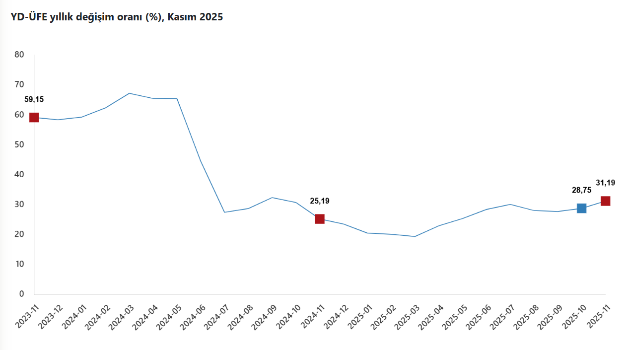 Yurt Dışı Üretici Fiyat Endeksi (YD-ÜFE), kasımda aylık bazda yüzde 1,02, yıllık bazda yüzde 31,19 artış gösterdi. Türkiye İstatistik Kurumu (TÜİK), kasım ayına ilişkin YD-ÜFE verilerini açıkladı. Buna göre YD-ÜFE, kasımda bir önceki aya kıyasla yüzde 1,02, geçen yılın aralık ayına göre yüzde 30,01, geçen yılın aynı ayına göre yüzde 31,19 ve 12 aylık ortalamalara göre yüzde 25,67 yükseldi. Sanayinin iki sektörünün yıllık değişimlerine bakıldığında madencilik ve taş ocakçılığında yüzde 40,75, imalatta yüzde 31,02 artış görüldü. Ana sanayi gruplarının yıllık değişimleri dikkate alındığında ara mallarında yüzde 28,24, dayanıklı tüketim mallarında yüzde 36,7, dayanıksız tüketim mallarında yüzde 38,38, enerjide yüzde 22, sermaye mallarında yüzde 29,75 artış gerçekleşti. Sanayinin iki sektörünün aylık değişimleri, madencilik ve taş ocakçılığında yüzde 2,82, imalatta yüzde 0,99 artış olarak hesaplandı. Ana sanayi gruplarının aylık değişimlerine bakıldığında ara mallarında yüzde 1,03, dayanıklı tüketim mallarında yüzde 0,37, dayanıksız tüketim mallarında yüzde 1,46, enerjide 4,65 ve sermaye mallarında yüzde 0,14 artış görüldü. [news_id:790147]