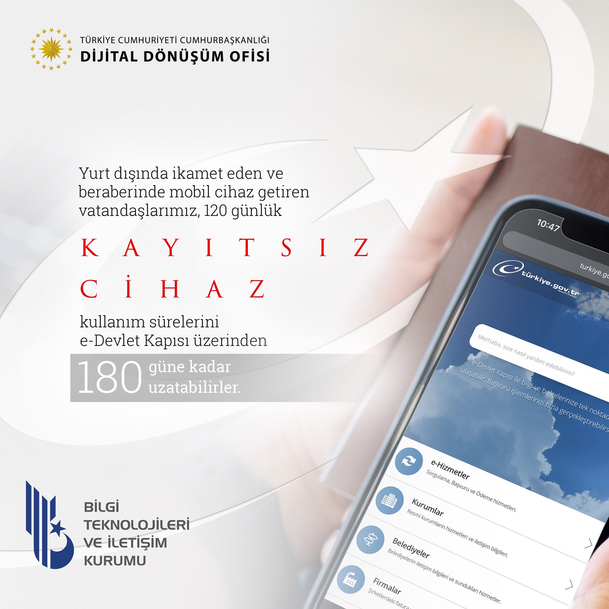 Yurt dışında yaşayan ve Türkiye'ye gelişlerinde cep telefonu getiren Türk vatandaşların, 120 günlük kayıtsız kullanım süresi 180 güne çıkarıldı. Cumhurbaşkanlığı Dijital Dönüşüm Ofisi, yurt dışından getirilen cep telefonlarının 120 günlük kayıtsız kullanım süresinin, e-Devlet üzerinden 180 güne çıkarılabileceğini duyurdu. Kaynak: CB Dijital Dönüşüm Ofisi - X Cumhurbaşkanlığı Dijital Dönüşüm Ofisi'nin paylaşımında "Yurt dışında ikamet eden ve beraberinde mobil cihaz getiren vatandaşlarımız, 120 günlük kayıtsız cihaz kullanım sürelerini otuzar günlük sürelerle 2 defaya mahsus olarak 180 güne kadar e-Devlet Kapısı üzerinden uzatabilirler" ifadelerine yer verildi. Ocak 2024 itibarıyla 31 bin 692 TL'ye yükselen IMEI kayıt ücretleri son yıllarda ise şöyle değişim göstermişti: [news_id:726541]