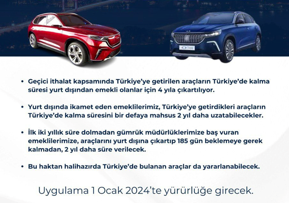 Yurt dışından satın alınan telefon ve otomobillerin kullanım süresinin artırılacağı bildirildi. AK Parti Genel Başkan Yardımcısı ve Dış İlişkiler Başkanı Zafer Sırakaya, yeni düzenlemeyle birlikte yurt dışından getirilen cihazların ve araçların kullanım süresinin artırılacağını bildirdi. Zafer Sırakaya, sosyal medya hesabından yaptığı açıklamada, "Yapılacak yeni düzenleme ile yurt dışı cep telefonlarına e-Devlet üzerinden 'Geçici haberleşme' için başvuru yapılması durumunda, mobil cihazların kullanım süresi 2 defaya mahsus olarak 30'ar gün uzatılabilecek" dedi. Sırakaya'nın paylaştığı infografiğe göre yurt dışından getirilen mobil cihazların Türkiye'de kaydedilmeden kullanma süresi 180 güne çıkarılacak. 120 günlük süre dolmadan e-Devlet'ten süre uzatım talebinde bulunanlar, yurt dışından getirdikleri telefonlarını 180 güne kadar kullanabilecekler. [news_id:699898] “Emeklilere ait araçlar 4 yıl kalacak” Sırakaya ayrıca yurt dışından emekli olup uzun süre Türkiye'de kalan vatandaşların geçici olarak ülkeye getirdikleri taşıtlar için 730 gün süre verildiğini bildirerek, "Bu sürenin tamamı kullanıldıktan sonra yurt dışından emekli olan vatandaşlarımızın taşıtı ile yeniden yurt dışına çıkış yapmasına gerek olmaksızın; bir defaya mahsus olmak üzere 730 güne kadar ek süre verilmesine yönelik düzenlememiz 2024'te yürürlüğe giriyor. Hayırlı uğurlu olsun" ifadelerini kullandı. Sırakaya'nın paylaştığı infografiğe göre, geçici ithalat kapsamında Türkiye'ye getirilen araçların ülkede kalma süresi, yurt dışından emekli olanlar için 4 yıla çıkarılıyor. Yurt dışında ikamet eden emekliler, Türkiye'ye getirdikleri araçların burada kalma süresini 1 defaya mahsus 2 yıl daha uzatabilecekler. İlk 2 yıllık süre dolmadan gümrük müdürlüklerine başvuran emeklilere, araçlarını yurt dışına çıkarıp 185 gün beklemeye gerek kalmadan, 2 yıl daha süre verilecek. Bu haktan halihazırda Türkiye'de bulanan araçlar da yararlanabilecek. Uygulama ise 1 Ocak 2024'te yürürlüğe girecek. Kaynak: Zafer Sırakaya - X