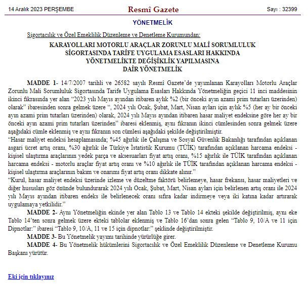 Zorunlu trafik sigortası aylık azami prim artış oranı, 2024 yılının ilk 4 ayı için yüzde 5 olarak belirlendi. 2023'ün mayıs ayından itibaren bu oran, aylık yüzde 2 olarak uygulanıyordu. Zorunlu trafik sigortalarının prim değişikliğine dair yönetmelik Resmi Gazete'de yayımlandı. Buna göre, zorunlu trafik sigortası aylık azami prim artış oranı 2024 yılının ilk 4 ayı için yüzde 5 olacak.Bu oran, 2023'ün mayıs ayından itibaren aylık yüzde 2 olarak uygulanıyordu. Öte yandan, trafik sigortası azami primi Mayıs 2024'den itibaren hasar maliyet endeksine göre belirlenecek. Hasar maliyet endeksi hesaplanmasında asgari ücret artış oranı yüzde 45, TÜİK'in açıkladığı yedek parça ve aksesuar fiyat artış oranı yüzde 30, motorlu araç fiyat artış oranı yüzde 15 ve araçların bakım onarım fiyat artış oranı ise yüzde 10 ağırlıkta olacak. Kaynak: Resmi Gazete