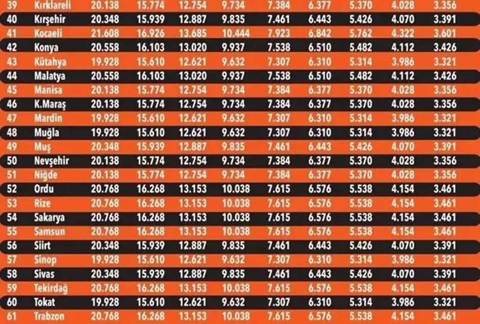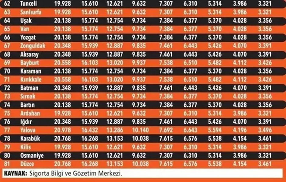 Zorunlu trafik sigortasında yapılan son değişikliklerin ardından Sigorta Bilgi ve Gözetim Merkezi, 1 Ocak’tan itibaren geçerli tavan tarifelerin bulunduğu güncel tabloyu yayımladı. İşte illere ve basamaklara göre yeni tavan ücretler.. Mayıs 2023'ten itibaren yüzde 2 olarak uygulanan zorunlu trafik sigortası aylık azami prim artış oranı aralık ayının ortasında 2024 yılının ilk 4 ayı için yüzde 5 olarak belirlenmişti. Kararın bir gün sonrasında ise Sigortacılık ve Özel Emeklilik Düzenleme ve Denetleme Kurumu (SEDDK), yetkisini kullanarak, 2024 yılının ilk 4 ayı içinde belirlediği trafik sigortasındaki yüzde 5’lik prim artışını ocak ayı için yüzde 10’a çıkarmıştı. [news_id:718189] Ocak ayına girilmesiyle birlikte ise yeni sigorta bedellerinde aralık ayına göre yüzde 10 artış yapıldı. Sigorta Bilgi ve Gözetim Merkezi de 1 Ocak tarihinden itibaren geçerli olan tarifelerin bulunduğu güncel tabloyu yayımladı. İllere ve basamaklara göre yeni tutarlar İlgili tarifeye göre yeni trafik sigortası tutarları en az miktar olarak İstanbul'da 3 bin 706 lira olurken, Ankara'da 3 bin 601 lira, İzmir'de ise 3 bin 496 lira olarak belirlendi. En yüksek trafik sigortası tutarları İstanbul'da 22 bin 236 lira olurken, Ankara'da 21 bin 607 lira, İzmir'de ise 20 bin 978 lira olarak belirlendi. Diğer illere ve basamaklara göre sigorta tutarları ise şöyle listelendi: Trafik sigortası nedir? Trafik sigortası, yaşayabileceğiniz bir kaza sonucunda karşı tarafın aracına, üçüncü şahısların malına ya da bedeni zararlarına karşı olan yükümlülüğünüzü poliçenizin kapsamındaki teminat ve limitlere göre sizin adınıza ödenmesidir. Araçta trafik sigortalarının bulunmaması halinde trafiğe çıkmaları kanunen yasaktır. Sigortasız olduğu tespit edilen araçlara ise ceza kesilmektedir. [news_id:719863]