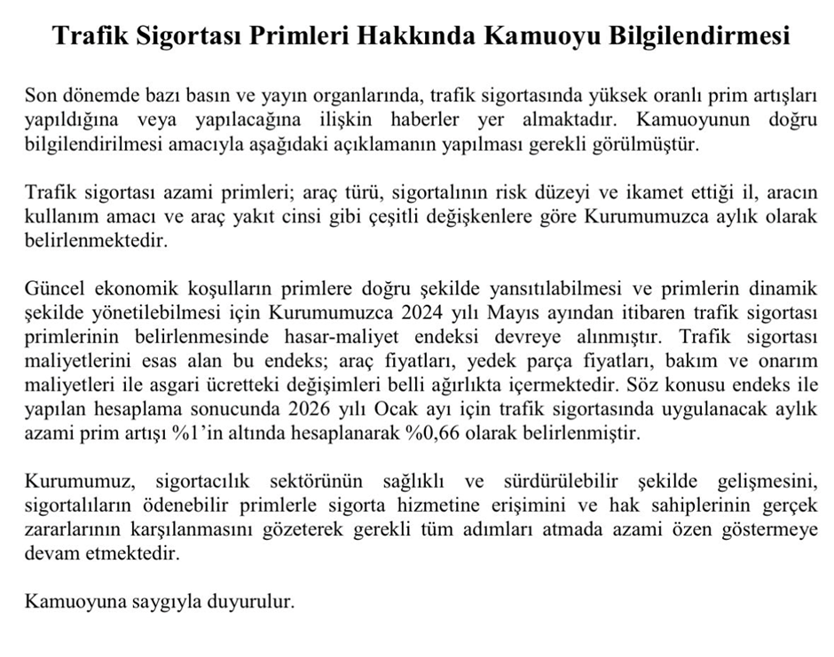 Sigortacılık ve Özel Emeklilik Düzenleme ve Denetleme Kurumu (SEDDK), Ocak 2026 için trafik sigortasında uygulanacak aylık azami prim artışının yüzde 1'in altında hesaplanarak yüzde 0,66 olarak belirlendiğini duyurdu. Sigortacılık ve Özel Emeklilik Düzenleme ve Denetleme Kurumu'ndan (SEDDK), yapılan açıklamada, trafik sigortasında yüksek oranlı prim artışları yapıldığına veya yapılacağına ilişkin haberler yer aldığı belirtilerek, kamuoyunun doğru bilgilendirilmesinin gerekli görüldüğü belirtildi. Açıklamada, trafik sigortası azami primlerinin araç türü, sigortalının risk düzeyi ve ikamet ettiği il, aracın kullanım amacı ve araç yakıt cinsi gibi çeşitli değişkenlere göre Kurumca aylık olarak belirlendiği hatırlatıldı. Güncel ekonomik koşulların primlere doğru şekilde yansıtılabilmesi ve primlerin dinamik şekilde yönetilebilmesi için SEDDK'nin Mayıs 2024'ten itibaren trafik sigortası primlerinin belirlenmesinde hasar-maliyet endeksini devreye aldığı anımsatılan açıklamada, "Trafik sigortası maliyetlerini esas alan bu endeks, araç fiyatları, yedek parça fiyatları, bakım ve onarım maliyetleri ile asgari ücretteki değişimleri belli ağırlıkta içermektedir. Söz konusu endeks ile yapılan hesaplama sonucunda 2026 yılı ocak ayı için trafik sigortasında uygulanacak aylık azami prim artışı yüzde 1'in altında hesaplanarak yüzde 0,66 olarak belirlenmiştir." ifadeleri yer aldı. Açıklamada ayrıca, SEDDK'nin sigortacılık sektörünün sağlıklı ve sürdürülebilir şekilde gelişmesini, sigortalıların ödenebilir primlerle sigorta hizmetine erişimini ve hak sahiplerinin gerçek zararlarının karşılanmasını gözeterek gerekli tüm adımları atmada azami özen göstermeye devam ettiği vurgulandı. Kaynak: SEDDK [news_id:794831]