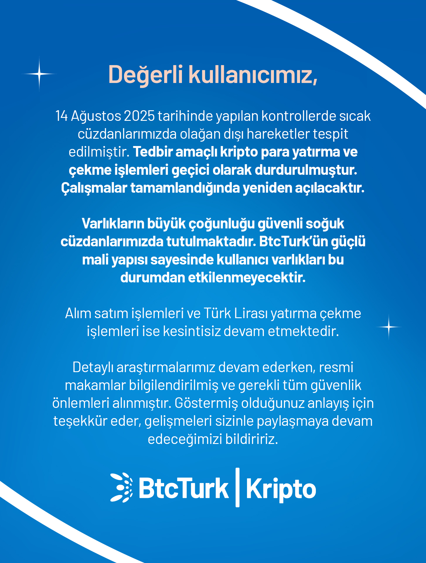 BtcTurk, sıcak cüzdanlardaki teknik bir sorun nedeniyle kripto para yatırma ve çekme işlemlerinin geçici olarak devre dışı bırakıldığını açıkladı. Kripto borsası BtcTurk, sosyal medya hesabından yaptığı paylaşımda, sıcak cüzdanlardaki teknik bir sorun nedeniyle kripto para yatırma ve çekme işlemlerinin geçici olarak devre dışı bırakıldığını açıkladı. İşlemlerin yeniden açıldığında bilgilendirme yapılacağı aktarılan açıklamada, alım satım işlemleri ve TL yatırma çekme işlemlerinin kesintisiz olarak devam ettiği bildirildi. Kullanıcı varlıkları tehlikede mi? BtcTurk yaptığı bir diğer sosyal medya paylaşımında ise şunları aktardı: "Değerli Kullanıcımız, 14 Ağustos 2025 tarihinde yapılan kontrollerde sıcak cüzdanlarımızda olağan dışı hareketler tespit edilmiştir. Tedbir amaçlı kripto para yatırma ve çekme işlemleri geçici olarak durdurulmuştur. Çalışmalar tamamlandığında yeniden açılacaktır. Varlıkların büyük çoğunluğu güvenli soğuk cüzdanlarımızda tutulmaktadır. BtcTurk’ün güçlü mali yapısı sayesinde kullanıcı varlıkları bu durumdan etkilenmeyecektir. Alım satım işlemleri ve Türk Lirası yatırma çekme işlemleri ise kesintisiz devam etmektedir. Detaylı araştırmalarımız devam ederken, resmi makamlar bilgilendirilmiş ve gerekli tüm güvenlik önlemleri alınmıştır. Göstermiş olduğunuz anlayış için teşekkür eder, gelişmeleri sizinle paylaşmaya devam edeceğimizi bildiririz." Kaynak: BtcTurk Siber saldırı iddiası BtcTurk’ün kararı öncesinde ise bazı sıcak cüzdanlardan yaklaşık 48 milyon dolar değerinde kripto para çıkışı olduğu tespit edilmişti. Blockchain analiz şirketi Cyvers tarafından belirlenen bu hareketlilik, olası bir siber saldırı şüphesini gündeme taşımıştı. Çok zincirli (multi-chain) transferlerin büyük kısmının iki farklı adrese konsolide edildiğini tespit eden Cyvers, Ethereum (ETH), Avalanche (AVAX), Arbitrum (ARB), Optimism (OP), Mantle (MNT) ve Polygon (MATIC) gibi varlıkların taşındığını duyurmuştu.
