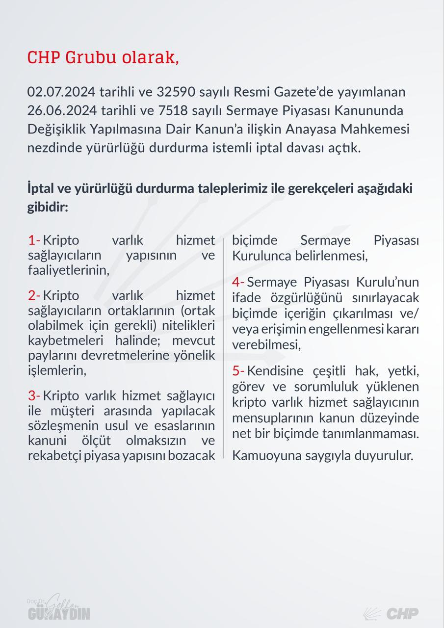 CHP, kripto varlıklarla ilgili düzenlemenin kamu yararına aykırı hükümlerinin yürürlükten kaldırılması istemiyle AYM'ye başvurdu. CHP Grup Başkanvekili Gökhan Günaydın, sosyal medya hesabı X'ten yaptığı paylaşımla kripto düzenlemesinin iptali için AYM'ye başvurduklarını duyurdu. Günaydın, paylaşımında, “02.07.2024 tarihli ve 32590 sayılı Resmi Gazete'de yayımlanan 26.06.2024 tarihli ve 7518 sayılı Sermaye Piyasası Kanununda Değişiklik Yapılmasına Dair Kanun'a ilişkin Anayasa Mahkemesi nezdinde yürürlüğü durdurma istemli iptal davası açtık" ifadelerini kullandı. Günaydın, iptal ve yürürlüğü durdurma taleplerini ve gerekçelerini ise şöyle sıraladı: 1-Kripto varlık hizmet biçimde Sermaye Piyasası sağlayıcıların yapısının ve faaliyetlerinin, 2-Kripto varlık hizmet sağlayıcıların ortaklarının (ortak olabilmek için gerekli) nitelikleri kaybetmeleri halinde; mevcut paylarını devretmelerine yönelik işlemlerin, 3- Kripto varlık hizmet sağlayıcı ile müşteri arasında yapılacak sözleşmenin usul ve esaslarının kanuni ölçüt olmaksızın ve rekabetçi piyasa yapısını bozacak biçimde Sermaye Piyasas Kurulunca belirlenmesi, 4-Sermaye Piyasası Kurulu'nun ifade özgürlüğünü sınırlayacak biçimde içeriğin çıkarılması ve/ veya erişimin engellenmesi kararı verebilmesi, 5-Kendisine çeşitli hak, yetki, görev ve sorumluluk yüklenen kripto varlık hizmet sağlayıcının mensuplarının kanun düzeyinde net bir biçimde tanımlanmaması. “ Kaynak: Gökhan Günaydın - X