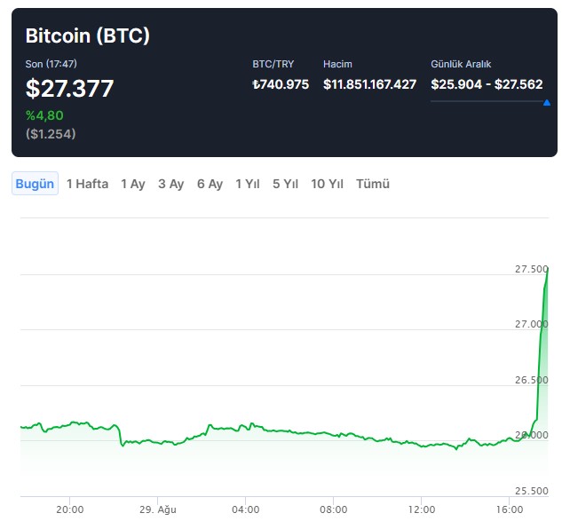Kripto para piyasalarının merakla beklenen davalarından biri olan Grayscale ile SEC arasındaki dava için mahkeme kararını açıkladı. Kararın ardından lider kripto para birimi Bitcoin ise %5’e yakın yükseldi. Grayscale Investment, Grayscale Bitcoin Trust (GBTC) ürününün Spot Bitcoin ETF’ine dönüştürülme talebinin SEC tarafından reddedilmesi üzerine bir karşı dava açmıştı. Bu dava için mahkeme ise bugün kararını açıkladı. Buna göre, Spot ETF'lerin onaylanması ya da Grayscale fonunun spot ETF olmasına yönelik bir karar çıkmadı ancak mahkeme, SEC'nin başvuruları redderken kullandığı argümanları geçersiz buldu. Bu ise SEC'nin bundan sonra yeni başvuruları aynı 'bahaneler' ile reddedemeyeceğine işaret etti. Bu da kripto piyasaları tarafından bir zafer olarak görülerek, kripto sektöründe alımların hızlanmasına yol açtı. Buna göre karar öncesinde 26 bin seviyesinde fiyatlanan Bitcoin (BTC), kararın ardından %5'e yakın yükselişle 27.377 dolara çıktı. Kaynak: Doviz.com - Bitcoin