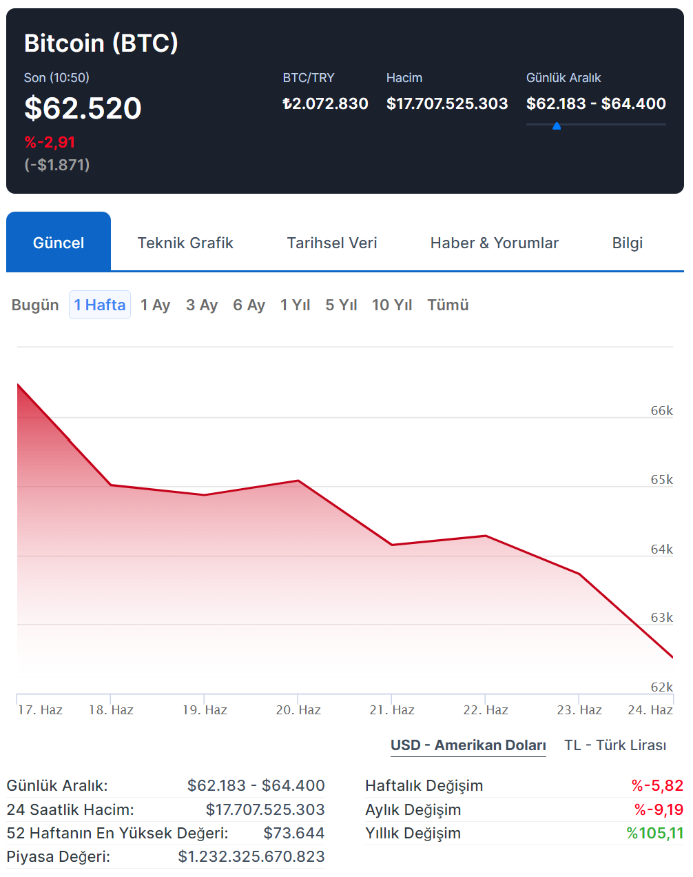 Piyasa değeri en yüksek 100 kripto varlığı içeren gösterge endeks, geçen haftayı yüzde 5 düşüşle tamamladı. Böylelikle nisan ayından bu yana kripto piyasaları en kötü haftalık performansını kaydetti. Bitcoin, yatırım fonlarına yönelik soğuyan talebin ve para politikasına ilişkin belirsizliğin etkisiyle geçen haftayı negatif tamamladı. Bu kapsamda en büyük 100 kripto varlıktan oluşan gösterge endeks, pazar gününe kadar geçen yedi gün içinde yaklaşık yüzde 5 düşerek nisan ayından bu yana görülen en kötü performansını kaydetti. İşlem hacmine göre lider kripto para birimi Bitcoin de yatırımcılarına benzer şekilde kayıp yaşattı. Bitcoin yeni haftanın ilk işlem gününde ise yüzde 2,91 düşüşle 62.520 dolardan fiyatlandı. Kripto piyasasındaki gerilemeler son olarak Fed'in faiz oranlarını yirmi üç yılın en yüksek seviyesinden düşürmesine yönelik şüphelerin artmasıyla hızlanmıştı. Bazı analistler için kripto varlıklardaki geri çekilme ise global çapta daha geniş bir risk iştahı için uyarı niteliğindeydi. FalconX Araştırma Müdürü David Lawant, konuyla ilgili bir notunda, mevcut kripto piyasası dinamiğinin “düşük volatilite ve hacimler ile karakterize edildiğini” yazdı. Bitcoin mart ayında 73 bin 644 dolar ile rekor kırmıştı. Ancak bu rekorun ardından ikinci çeyrekte hisse senetleri, tahviller ve altın gibi geleneksel varlıkların gerisinde kaldı. IG Australia Pty Piyasa Analisti Tony Sycamore ise "57 bin 500 dolar seviyesindeki 200 günlük hareketli ortalama, şu anda fiyat için olası bir destek bölgesi olarak takip ediliyor." değerlendirmesinde bulundu. [news_id:737402]