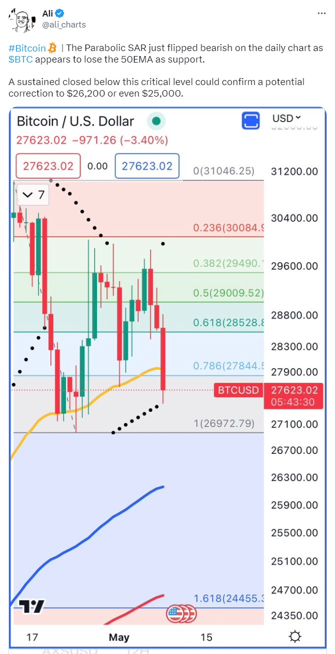 Kripto para analisti Ali Martinez, sosyal medya hesabı üzerinden yaptığı paylaşımda, Bitcoin'e yönelik öngörülerini ve önemsediği kritik seviyeleri paylaştı. Twitter üzerinden analizini paylaşan Martinez, 27.430 dolar ile 28.250 dolar aralığının Bitcoin için önemli bir talep bölgesi olduğunu belirtti. Martinez, bu destek seviyesinin korunamaması halinde ise Bitcoin’in 24,000 dolar ile 24,900 dolar aralığına düşebileceği uyarısında bulundu. Öte yandan Martinez, Bitcoin’in yükseliş ivmesini sürdürmek ve daha fazla kayıptan kaçınmak için 29.150 doların üzerine çıkması gerektiğine de vurgu yaptı. Ancak Martinez, Bitcoin’in bir dizi düşük tepe ve düşük dip oluşturduğu için teknik olarak potansiyel bir fiyat düşüşü yaşanabileceğini belirterek, 50 günlük EMA’nın altında sürekli bir kapanış gerçekleşmesi halinde 26.200 dolar ve 25.000 dolara kadar geri çekilebileceğini kaydetti. Kaynak: Ali Martinez - Twitter